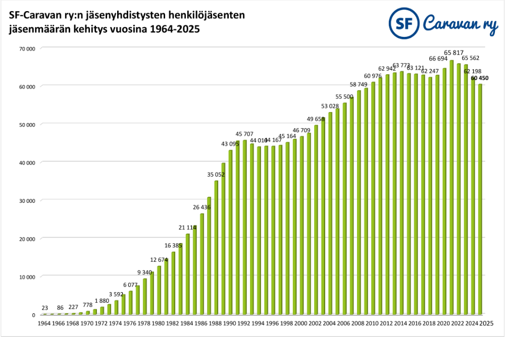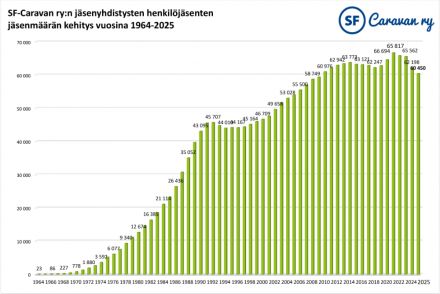 SF-Caravan ry:n 80 jäsenyhdistyksen henkilöjäsenten määrä oli vuoden vaihtuessa yhteensä 60 450 (31.12.2025). Kokonaisjäsenmäärä laski 2,8 prosenttia vuoden takaiseen verrattuna. Samalla aikajaksolla matkailuajoneuvoja ensirekisteröitiin Suomessa 11 prosenttia edellisvuotta vähemmän.