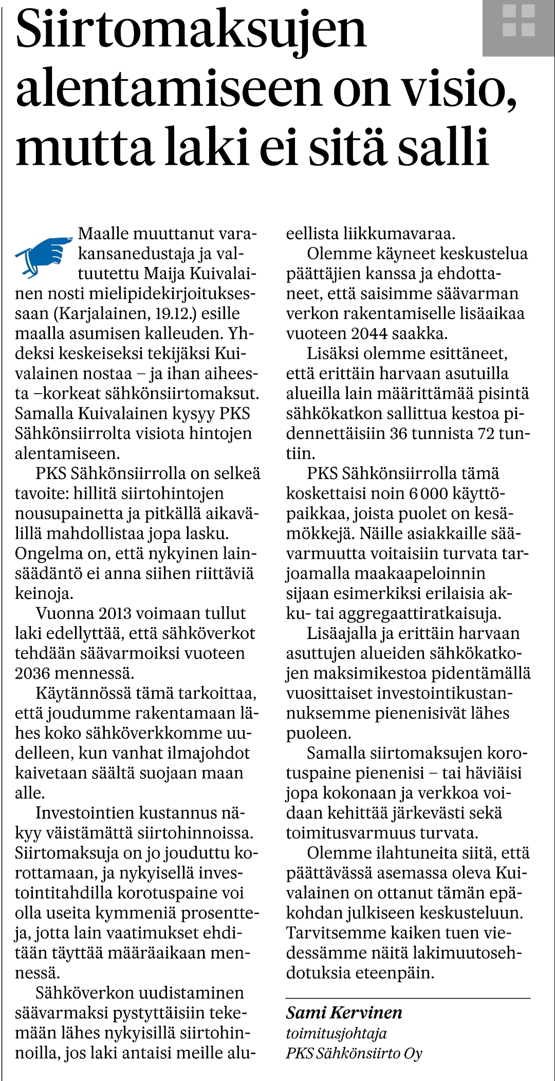 Tuossapa kuvakaappauksessa sähkönjakeluyhtiön johtajan kommentteja siirtohintoihin.