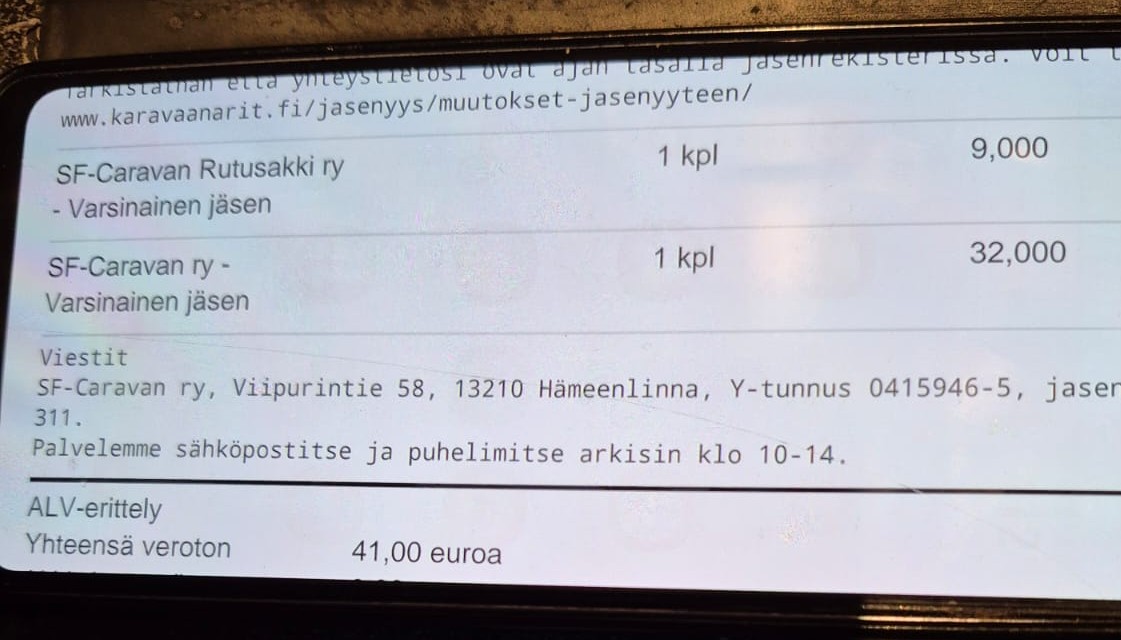 Tuosta paperilaskusta selviää maksujen liitto/yhdistykset maksujako. Sen sijaan tuo ennakkoon tehty ja sähköpostissa tullut tarjous ei eroittele muuta laskusta kuin Caravan lehden osuuden jos sitä ei halua paperipainoksena.