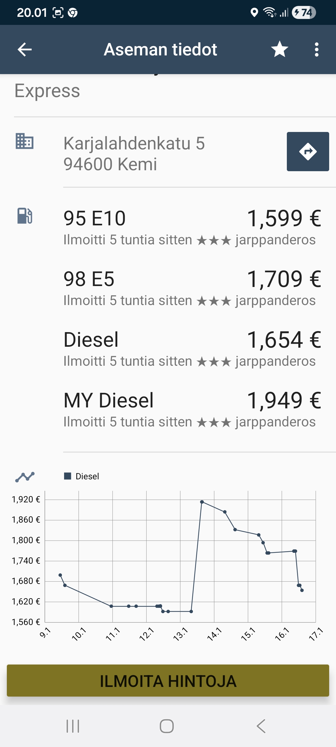 Täällä disel 1,53 € /l 95e bensa noin 1,39–1,41 euroa /l Tähän tietenkin vaikuttaa tämä persujen hinnan alennus/ruotsin raja. Tämä hinta siis tuossa 8 km päässä Ruotsin puolella. Varmaankin arvaatte mistä tankataan