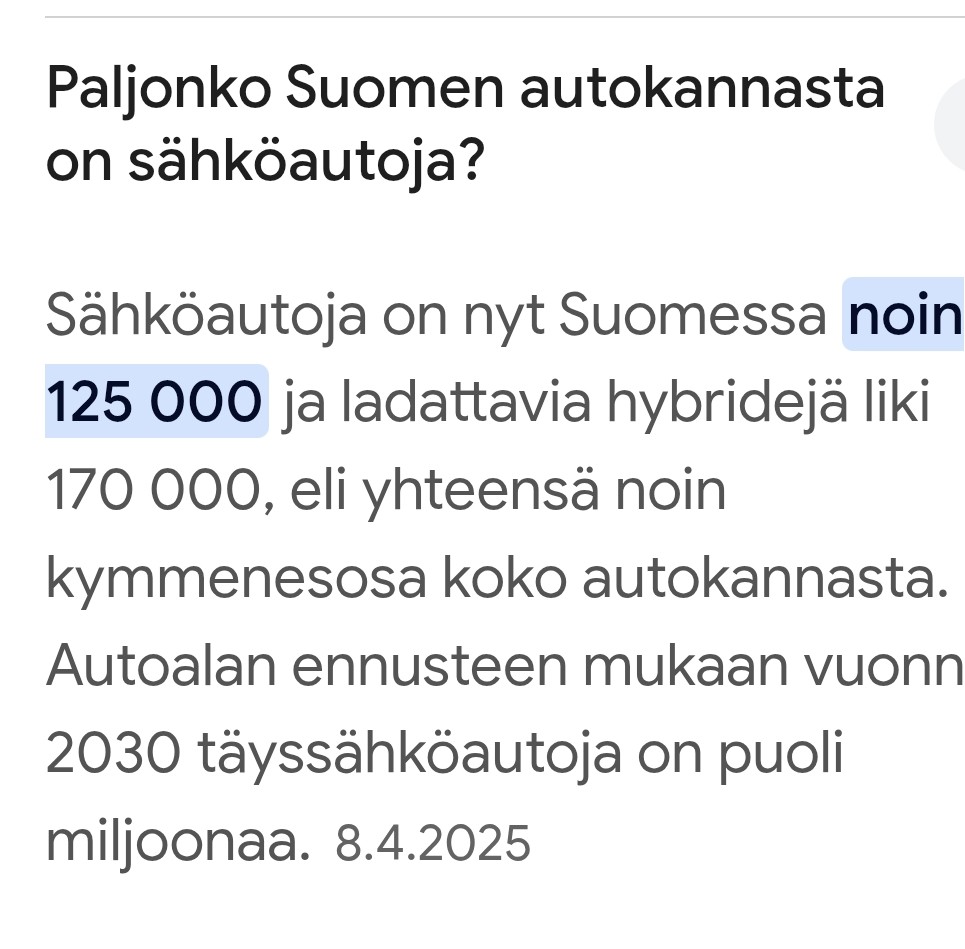 V. 2025 300 000 töpseli autoa kerralla 11 kw laturiin vartiksi = 3 300 000 kw lataus tehon, joka tuplaa muutamassa vuojessa.