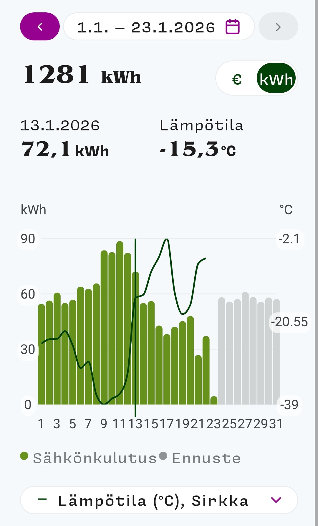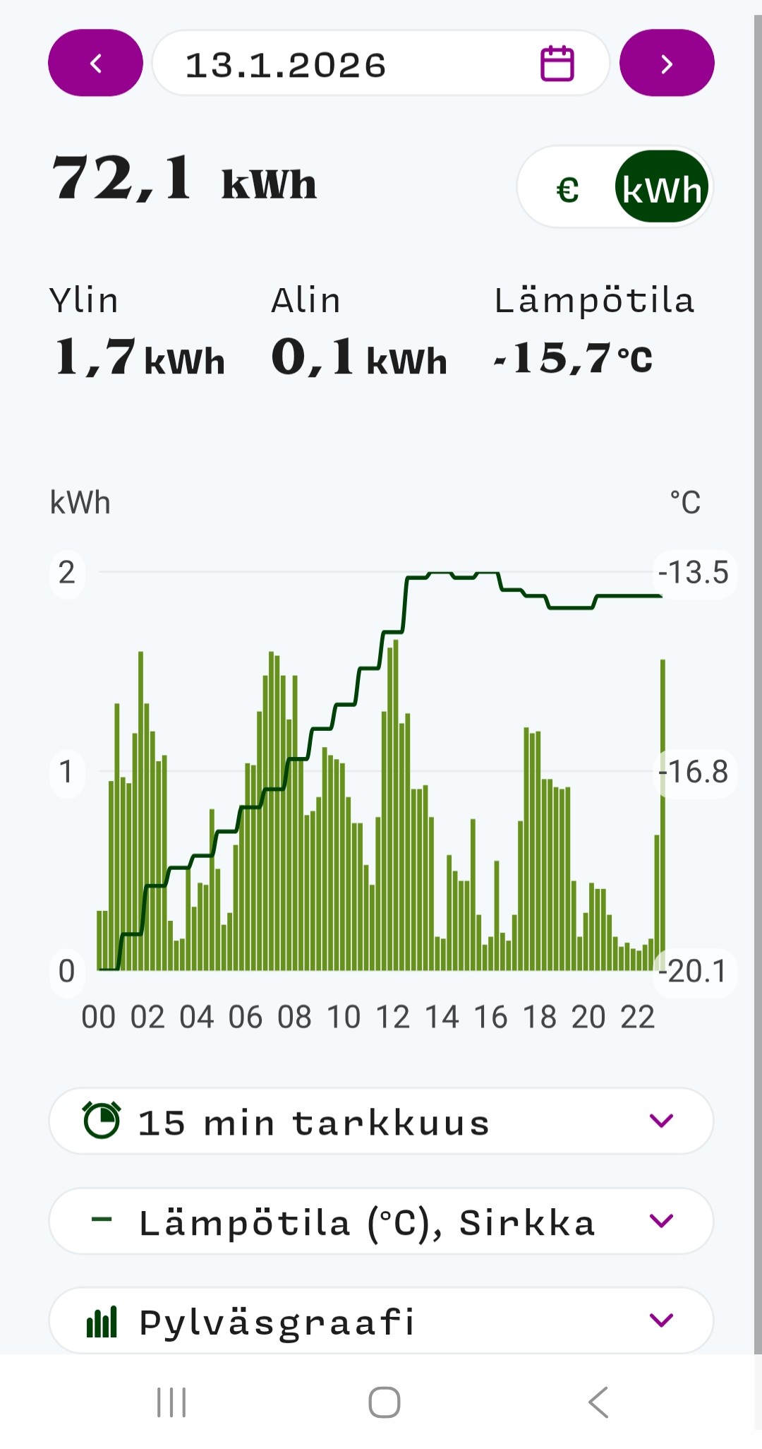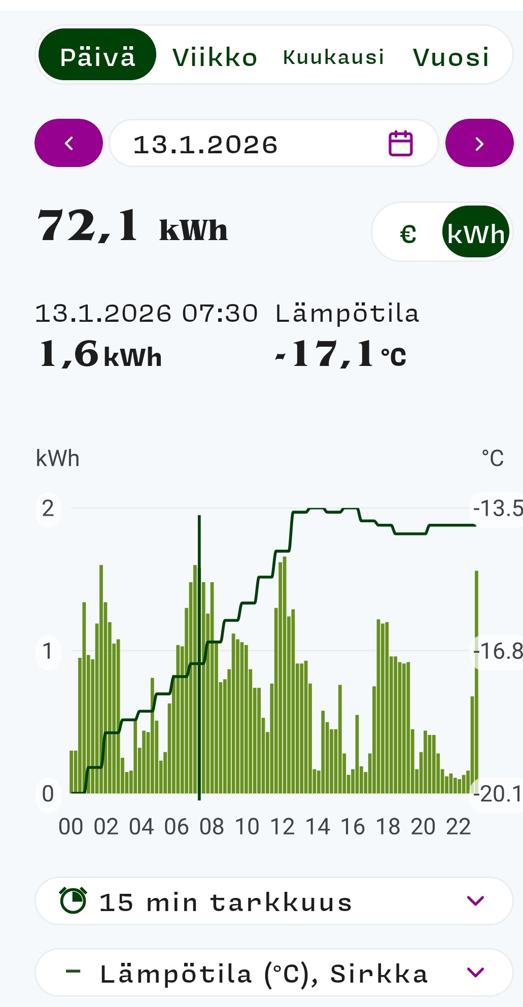 13.1.2026 sähkölämmitteisessä talossa "huippu" 1.6 tai 1.7 kw kulutus vartti (1.7x4=6.8kwh) joka kerran siis monta kertaa vuorokaudessa.