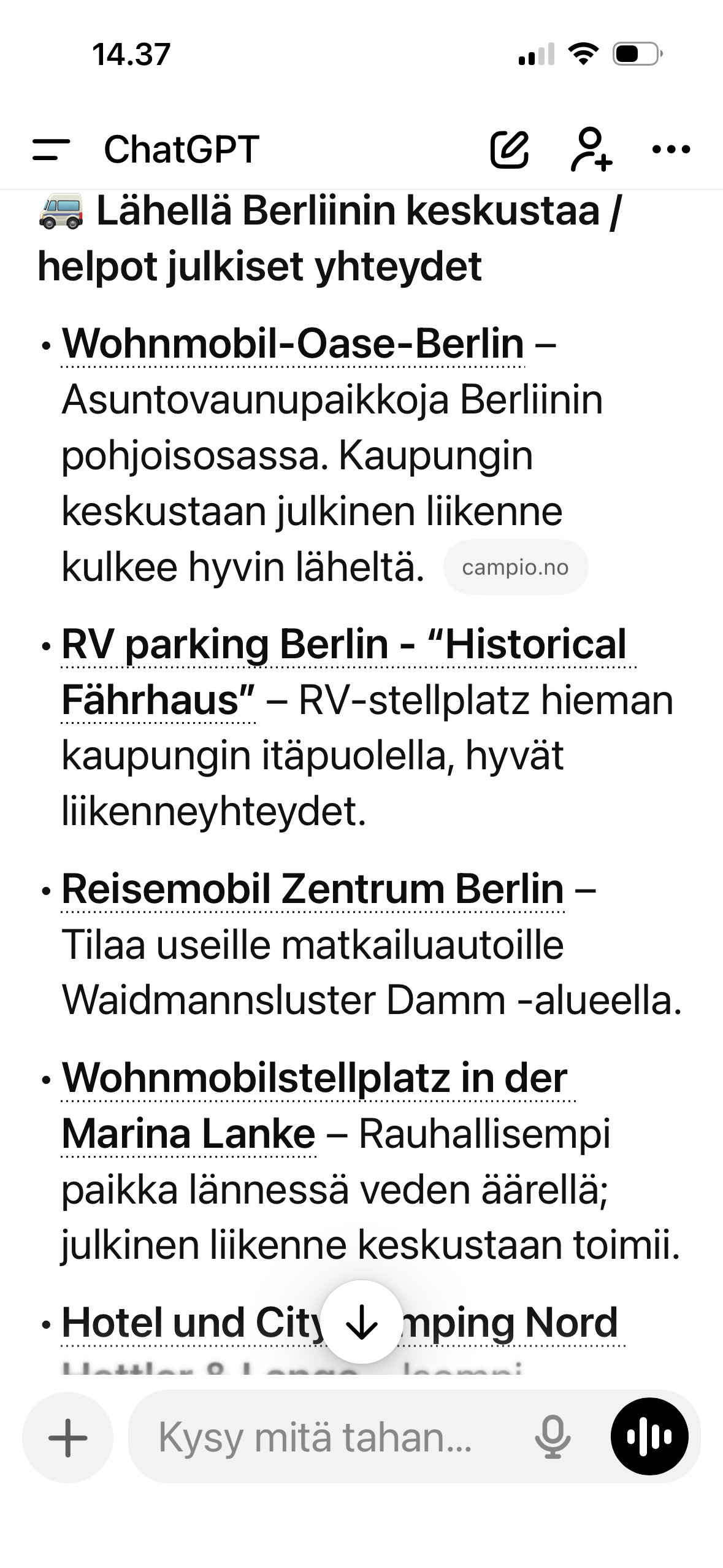 Hei, päivä on lyhyt aika Berliiniin. Kaupunki on suuri, eikä sillä ole yhtä keskustaa vaan paikkoja on ympäri kaupunkia. Esim. Barndenburgin ympäristössä on kävelymatkan päässä holokaustin muistomerkki, Potsdamerin aukio, Berlin Mall ostoskeskus, Hitlerin bunkkeri, Topographie of terror näyttely ja SS ja Gestapon päämaja, Hitlerin kirjarovio paikka ym... Pelkästään tänne kuluu aikaa, jos näistä paikoista tykkää. Asuntoauton pysäköintiin ja yöpymiseen suosittelen Tegelissä olevaa Reisemobile Zentrum Berlin Stellplatzia. Tegel, jossa myös on kauppoja, ravintoliota ym. on kävelymatkan päässä stellplatzilta ja sieltä pääsee Metrolla tai S-Bahnilla suoraan esim. Brandenburille. Tosin Tegelin metroasema on ollut remontissa, mutta S-Bahn numero 25 kulkee 20 min välein ja on nopeampi kuin Metro. Toinen majoituspaikka on on Oranieburgissa Stellplatz, josta pääsee myös S-Bahnilla kaupunkiin, mutta näistä paikoista suosittelen ehdottomasti Tegeliä. Yksi päivä vain ei ole riittävästi.