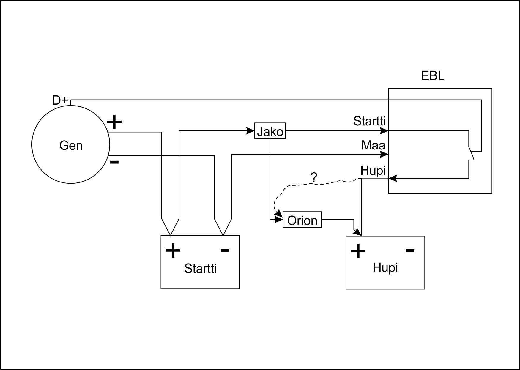 Kohtien A – D perusteella tein liitteen mukaisen kuvan (josta tosin puuttuu useimmat maajohdot). Mutta jos piirtämäni kuva vastaa kytkentääsi, niin kohta E ei käy järkeeni. Tuo kohdan E mukainen kaapeli näkyy kuvassani katkoviivalla. Olen piirtänyt EBL:n sisälle latausreleen, joka vetää moottorin käydessä (eli kun moottorilaturilta tuleva D+ on aktiivinen). Katkoviivalla piirretty kaapeli saa virtaa EBL:n hupiakkuliitännästä vain moottorin käydessä, mutta saman asian tekee jakorasialta Orionille kulkeva kaapeli. Vai pitäisikö selostuksesi kohta E muuttaa näin: ”… vain yksi kaapeli jakorasialta DC-DC -laturille”? Jos näin on, niin sitten kuvani (ilman katkoviivoitettua nuolta) vastaa korjattua selostustasi.