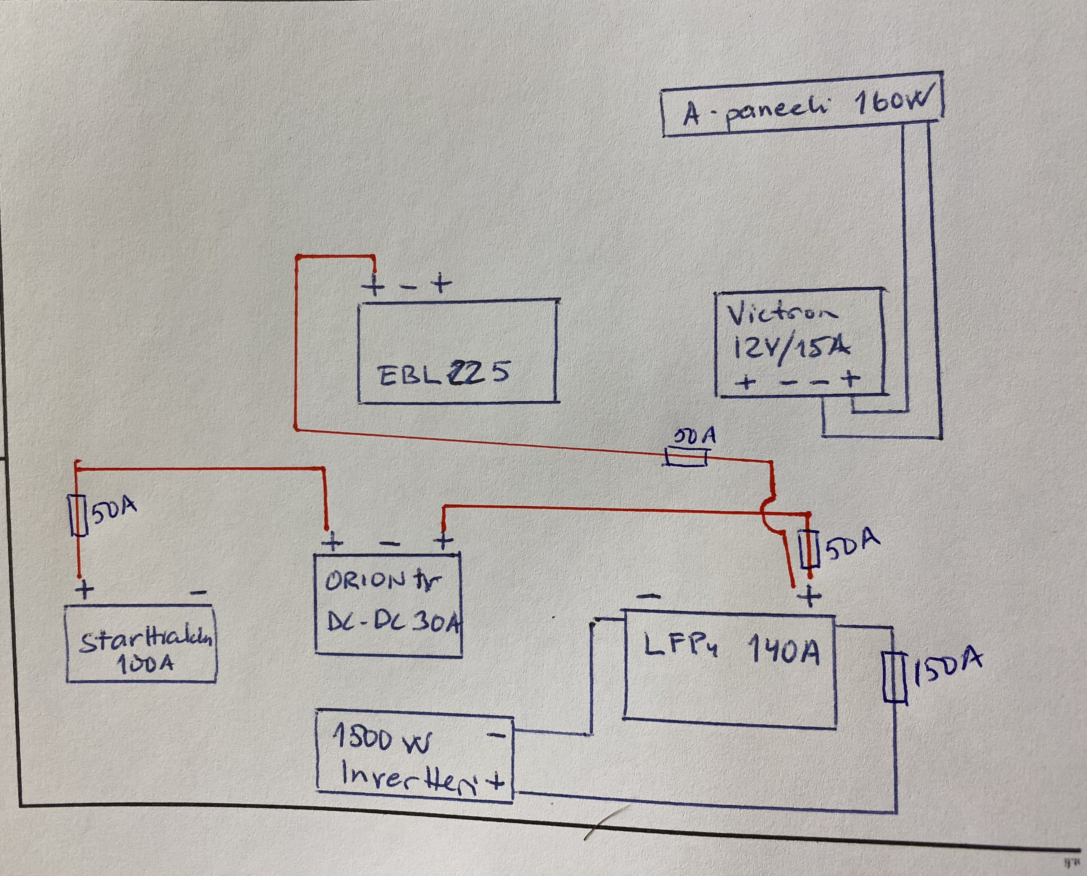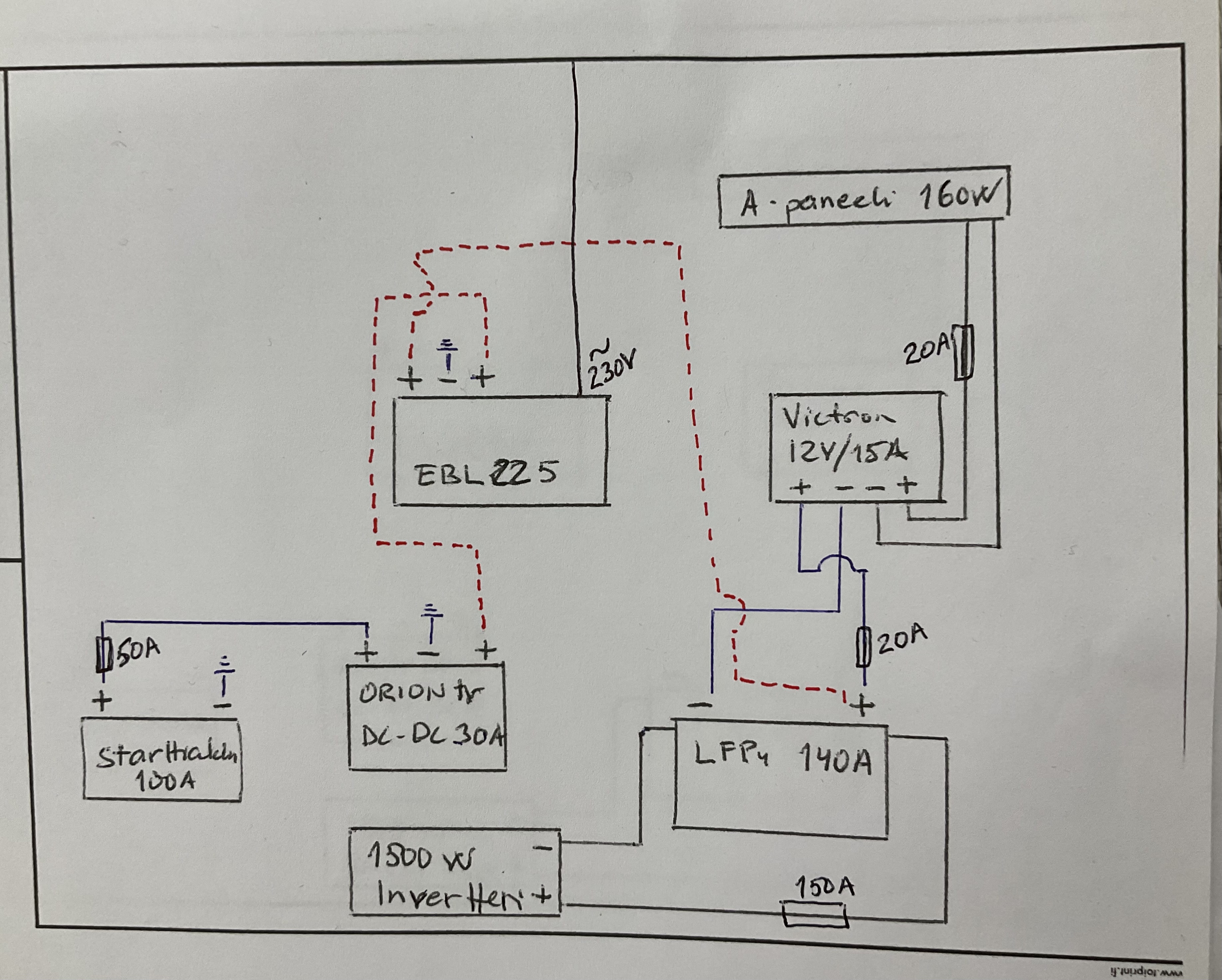 Minulla on muuten juurikin näin mutta haaroitin tuon starttiakulta EBL.lle tulevan kaapelin jakorasiassa. Toinen haara menee EBL.ään alkuperäiseen paikkaan ja toinen Orion TR DC-DC12-30A +napaan. Kaikki itse lisätyt maakaapelit on myös minulla samassa maakiskossa eli kytkettynä samaan potentiaaliin kuin auton runkokin.