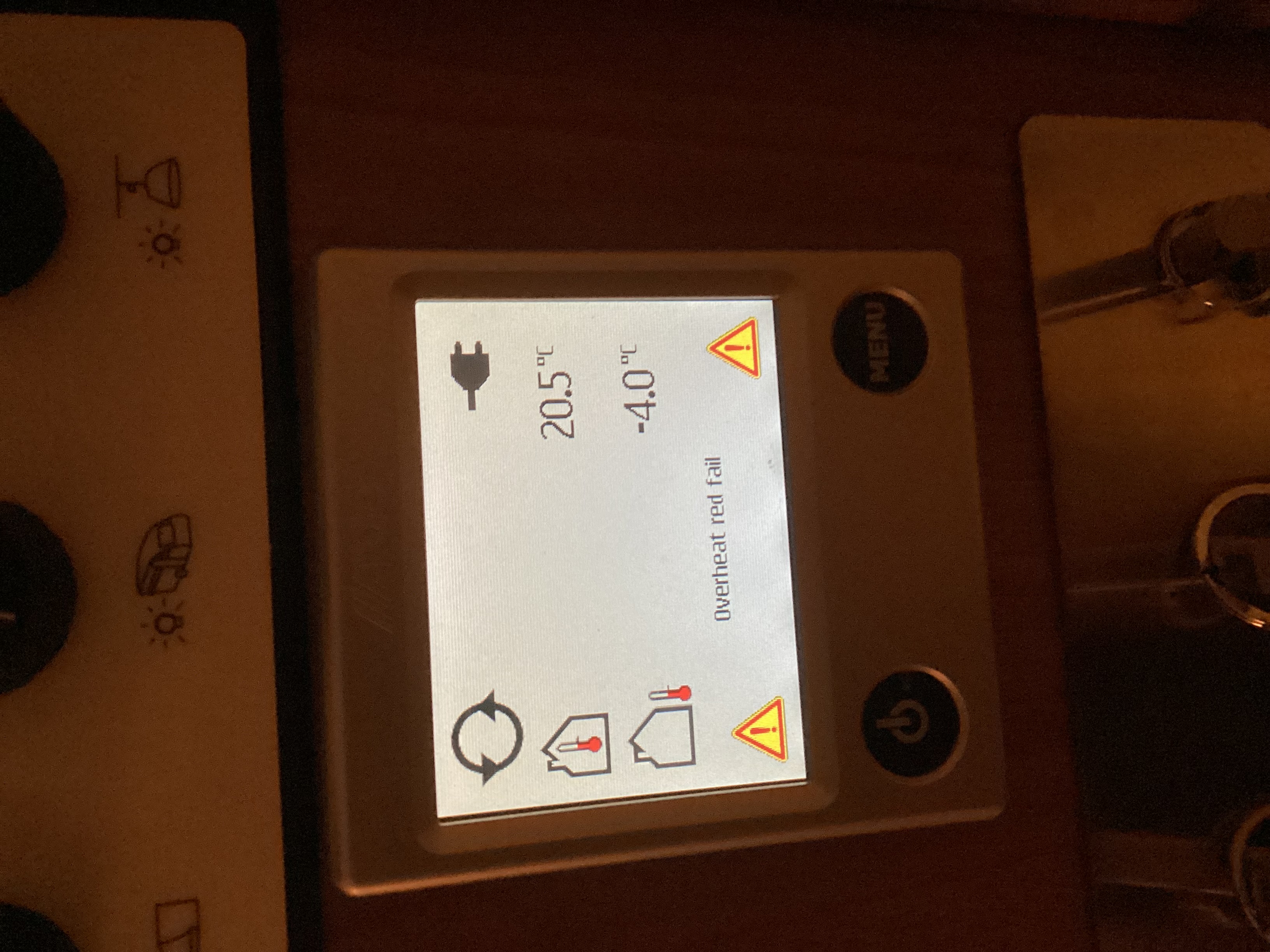 Hei! Mikä neuvoksi, reissun päällä tuli tämmöinen ilmoitus. Mahtaiskos auttaa jos sammuttaa lämppärin joksikin aikaa? Sama ongelma sähköllä ja kaasulla.
