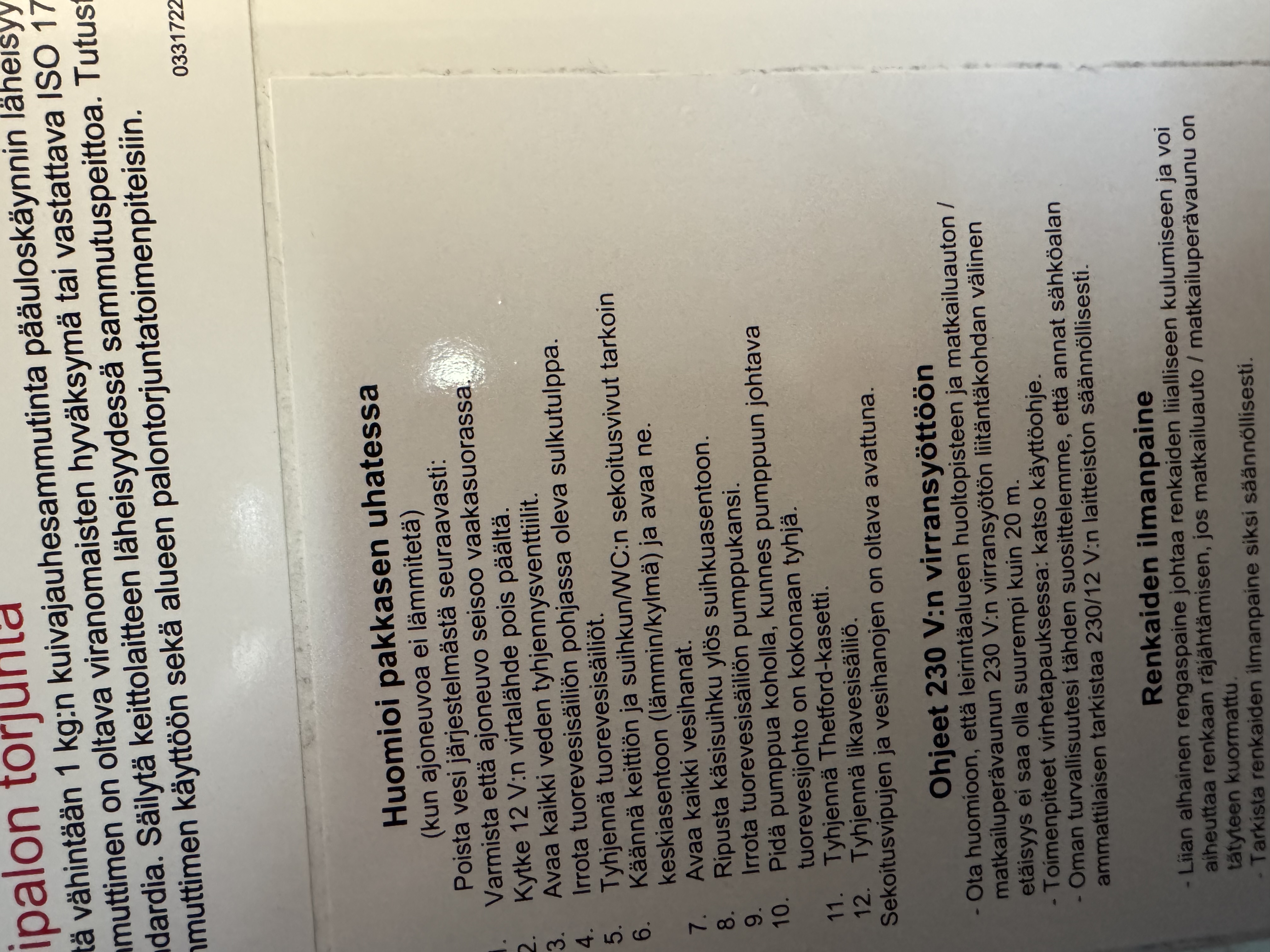 Säiliön tyhjentämiseen jälkeen kaikkia hanoja voi kytkeä (sähkö päällä), vessaa myös. Huomioi suihkun letku.