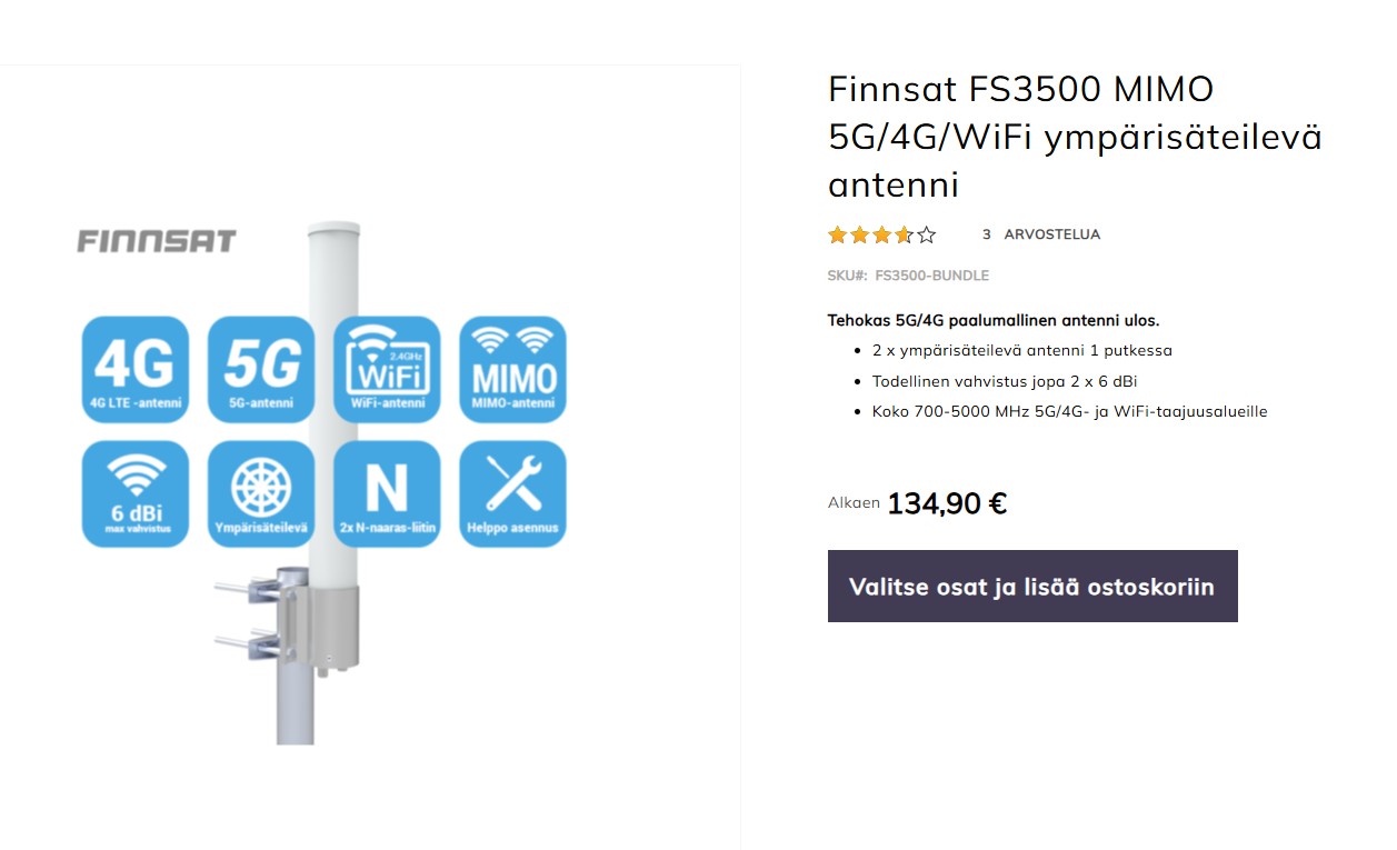 Myytävänä matkailuautoon /-vaunuun sopiva 5G reititin ja ulkoantenni yhdistelmä. Reititin ZTE U50 5G ja ulkoantenni Finnsat FS3500 5G. Reititin saa sähkönsä UCB-C liittimestä joten toimii 12V järjestelmissä. Ulkoantennin voi kiinnittää parhaiten pyörätelineeseen, josta vedetään ikkunan kautta kaapelit sisällä olevalle reitittimelle. Kaapelit mukana n. 3m. Käytin kyseistä pakettia Euroopan kiertomatkalla 5kk ajan ja etätyöt onnistuivat hyvin. Ulkoantenni parantaa signaalia hyvin ja katveita ei ollut. Reitittimeen laitetaan SIM-kortti ja sen jälkeen käytössä on langaton verkko. Esim. Espanjassa meillä oli käytössä Prepaid puhelinkortti, hinta 20€/28 vrk ja nettiä 300GB. Kun kuukausi oli kulunut niin seuraavan kuukauden sai aktivoitua omalla kännykällä. Liittymään kuului myös roamingia 30GB. Ostokuitit tulee mukana, tuotteet ostettu 2025, joten takuut voimassa.