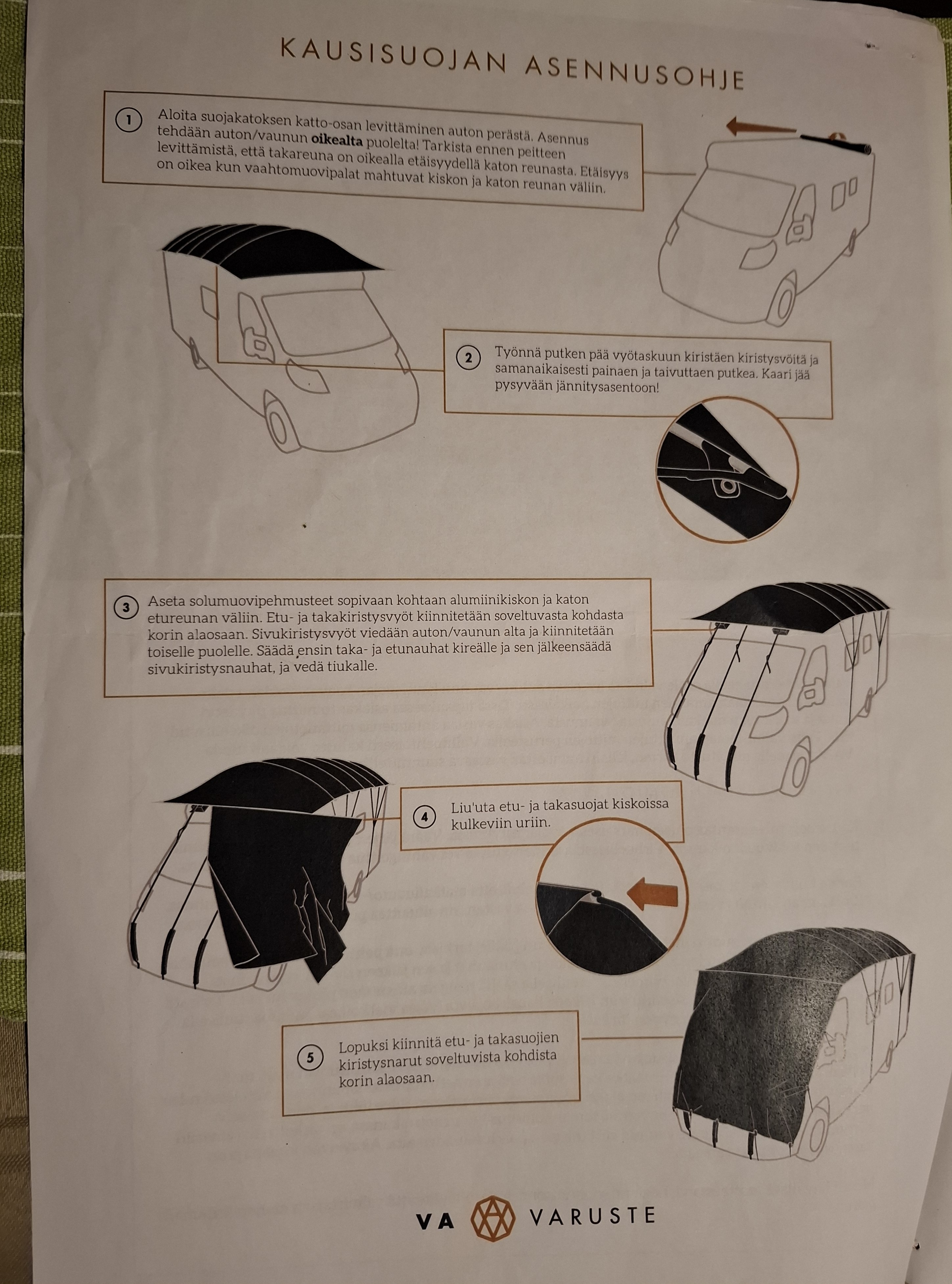 Yhden talven käytössä ollut VA-varusteen kausisuoja etu- ja takapeitteellä.
