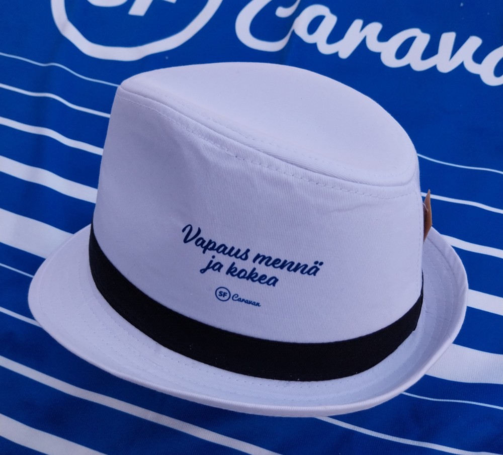 Valkoinen polyesterhattu, jossa musta koristenauna ja vasemmalla takana slogan "Vapaus menneä ja kokea - SF-Caravan" tumman sinisellä painettuna.