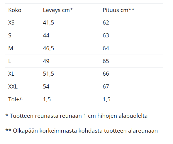 HUOM. Mitoitus on niukka, suositellaan tilaamaan normaalia suurempi koko.