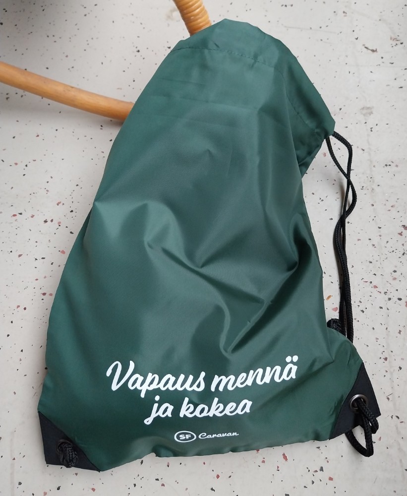Kevyt, kosteudenpitävä pussi saunareissulle tai uimahalliin. Väri tumma vihreä, painatus valkoisella.